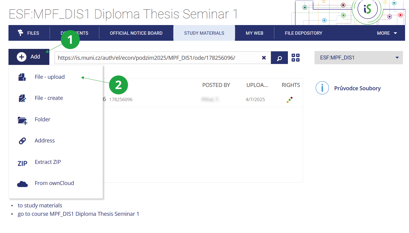 on IS?Yes, they are. Provided a student wants to offer other users some of his/her study materials (e.g. his/her lecture notes), he/she should use the following path:The Information System Student [course] File VaultThe files can consequently be accessed by all the students enrolled in the course (before the beginning of teaching period this includes all of those who have registered for the course). When preparing study materials for the upcoming term and copying the old ones into it, teachers can include in them also the files uploaded by the students in the past. The folders Learning Materials, Assignments, Course-Related Instructions and File Vault are created the first time a user enters the tree of the course.