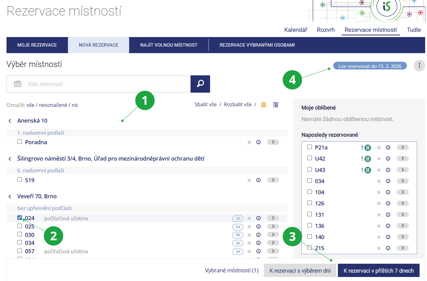 Najde zde seznam místností, které má právo rezervovat. Jedná se o místnosti, u kterých je uživatel uveden v Kontaktních údajích nebo jsou označeny některým z atributů „Smí rezerovat“, „Smí rezerv. učo“, „Smí sprav. učo“ či „Smí rezerv. sk.“ a uživatel spadá do jejich hodnot. Hodnotou atributu „Smí rezervovat“ je ID pracoviště. Takovou místnost si může uživatel zarezervovat, pokud pracuje (jako zaměstnanec, učitel, doktorant nebo má právo s_rezerv_mist) na stejném pracovišti nebo jeho podpracovišti.