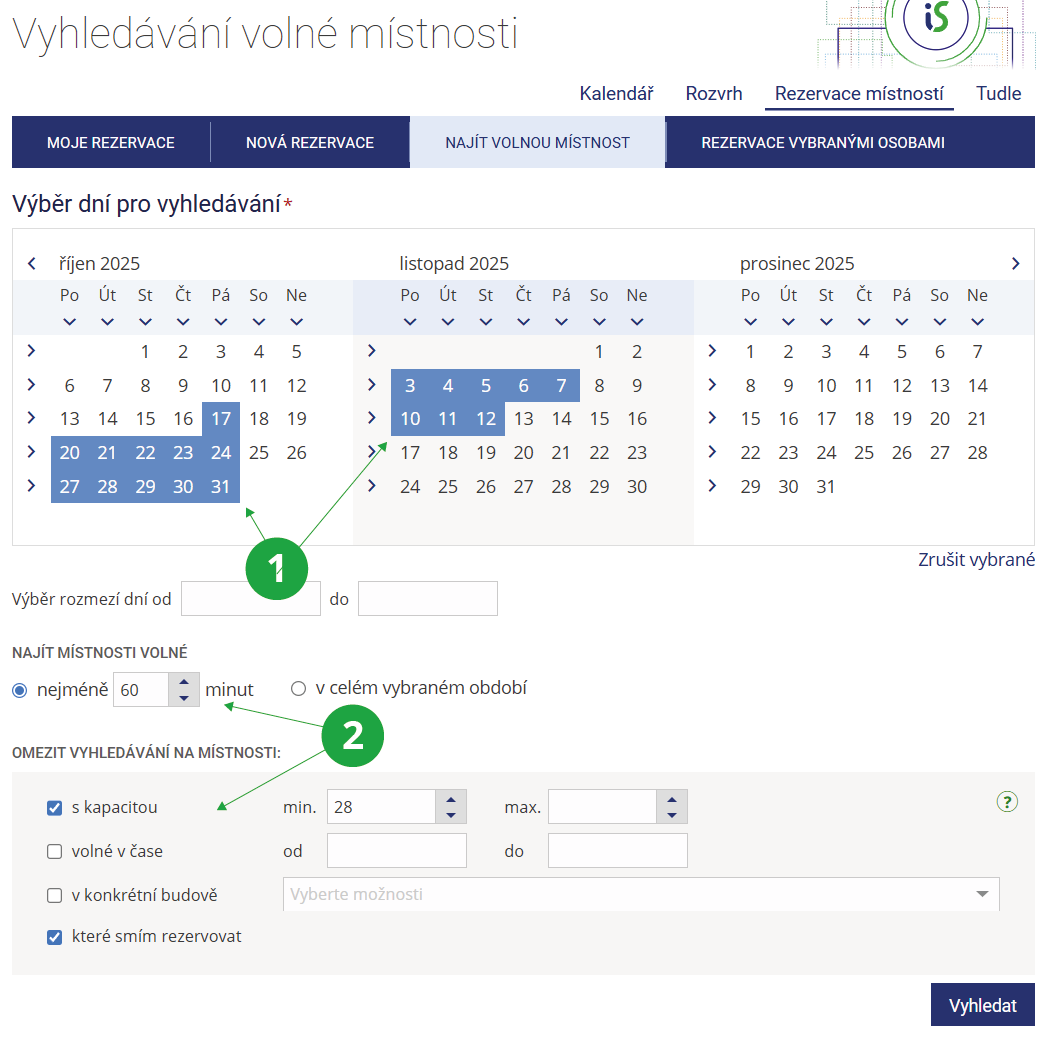 Toto omezení neplatí pro osoby s nadřazeným právem s_rezerv_mist pro vybranou fakultu, které mají možnost rezervovat místnosti i mimo uvedené datum. V tomto případě je potřeba změnit interval zobrazených dnů a požadované datum dohledat. Omezení neplatí také v případě, že je místnost označena atributem „Nevýuková místnost“. Takovou místnost lze rezervovat kdykoliv od aktuálního dne po dobu uvedenou v hodnotě atributu (měsíce nebo roky).